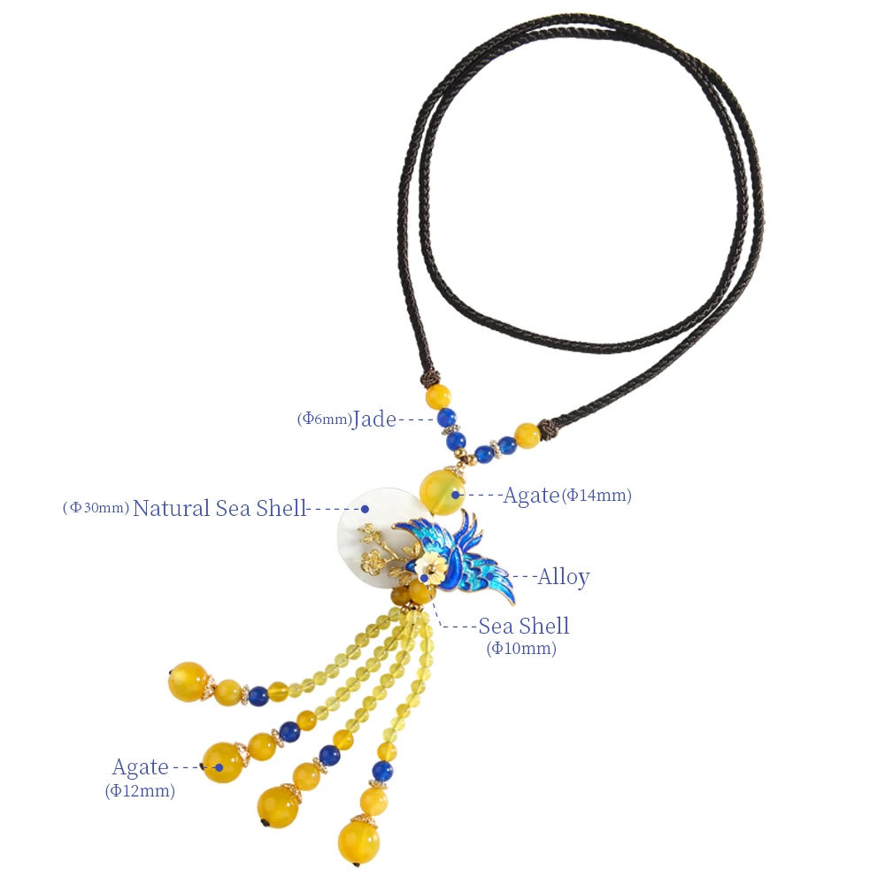 Ethnic Handmade Blue Phoenix Pendant Beads Chain Tassel Necklace for Women Jewelry Long Beads Chain